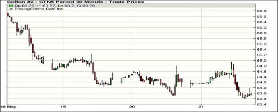 5月21日出口數(shù)據(jù)保持強(qiáng)勁,但紐約期棉跌勢(shì)不改,主力合約跌破64美分;1507月合約結(jié)算價(jià)63.73美分/磅,跌42點(diǎn);1512月合約收于64.70美分/磅,漲27點(diǎn)。當(dāng)日主力合約繼續(xù)下挫,上半場(chǎng)交易在64.10-64.60美分/磅之間浮動(dòng),下半場(chǎng)交易沖至高點(diǎn)后下跌,最終收于低位。日前有傳言稱印度競(jìng)賣將面向世界各個(gè)國(guó)家和地區(qū),但價(jià)格依然不降。但由于對(duì)印度和中國(guó)儲(chǔ)備政策的擔(dān)憂,多頭受到牽制,棉價(jià)繼續(xù)下跌。