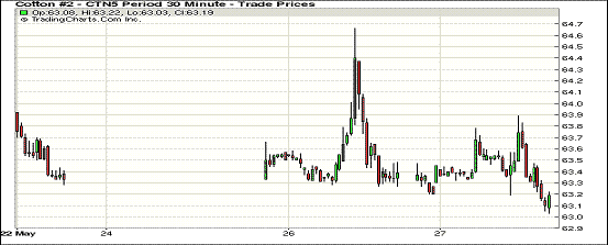 5月27日紐約期棉繼續(xù)小幅下跌,1507月合約結(jié)算價(jià)63.05美分/磅,跌26點(diǎn);1512月合約收于64.03美分/磅,跌5點(diǎn)。當(dāng)日主力合約小幅震蕩,下半場(chǎng)交易沖高,在63.80美分/磅以上,隨后回落,最低價(jià)63.03美分/磅,僅低于收盤(pán)價(jià)2點(diǎn)。跌幅0.41%。7/12月合約價(jià)差98點(diǎn)。上周五公布的美國(guó)物價(jià)指標(biāo)高于預(yù)期,投資者猜測(cè)美聯(lián)儲(chǔ)加息可能提前,投資者信心不足,加上本周美元指數(shù)保持震蕩上升,商品價(jià)格受到打壓。
