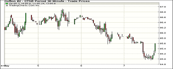 5月7日美元指數(shù)走強(qiáng),整體外部市場(chǎng)弱勢(shì),紐約期棉繼續(xù)小幅下跌;1507月合約結(jié)算價(jià)65.53美分/磅,跌33點(diǎn);1512月合約收于65.43美分/磅,跌34點(diǎn)。當(dāng)日主力合約高開,全天大部分時(shí)間走勢(shì)平穩(wěn),午間下跌后在低位保持,收盤前拉升反彈,跌幅0.50%。7/12月價(jià)差10點(diǎn)。