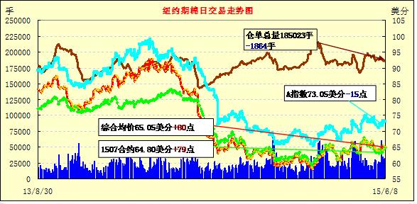 6月9日美元漲跌互現(xiàn);1507月合約結(jié)算價(jià)64.55美分/磅,跌25點(diǎn);1512月合約收于65.37美分/磅,漲3點(diǎn)。當(dāng)日主力12月合約高開,早間交易平緩,盤中開始震蕩但幅度不大,收盤前升至最高價(jià)66.27,但最終回落。7/12月合約價(jià)差82點(diǎn)。