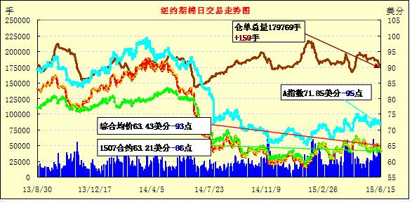 6月15日紐約期棉保持弱勢(shì)不變,主力合約大幅下跌;1507月合約結(jié)算價(jià)63.21美分/磅,跌86點(diǎn);1512月合約收于63.63美分/磅,跌103點(diǎn)。當(dāng)日主力12月合約高開(kāi)低走,早間交易跌幅較小,下半場(chǎng)走勢(shì)一路下滑,最低價(jià)63.37美分/磅,收盤前震蕩回升。7/12月合約價(jià)差42點(diǎn)。目前全球庫(kù)存的40%在中國(guó)國(guó)儲(chǔ),近期市場(chǎng)預(yù)計(jì)中國(guó)即將展開(kāi)儲(chǔ)備棉銷售,對(duì)期棉施壓,另有傳言稱印度棉花公司降價(jià)銷售,期棉在短期內(nèi)壓力較大。