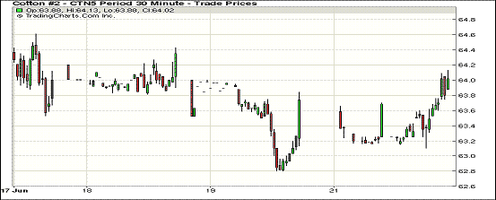 6月22日紐約期棉收復(fù)周五跌幅,合約全線上漲,主力合約漲幅稍大;1507月合約結(jié)算價(jià)64.03美分/磅,漲71點(diǎn);1512月合約收于64.80美分/磅,漲90點(diǎn)。當(dāng)日主力合約走勢(shì)較強(qiáng),盤終收于高位。漲幅1.40%,7/12月合約價(jià)差擴(kuò)大,至77點(diǎn)。本周第一個(gè)交易日,美國(guó)大宗商品普遍上漲,其他軟商品上漲,利好環(huán)境帶動(dòng)期棉收高。