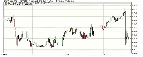 7月10日,美國農業(yè)部供需報告調增下年度期末庫存,紐約期棉再次收跌;1512月合約結算價65.52美分/磅,跌34點;1512月合約收于65.55美分/磅,跌25點。當日期棉主力合約大部分交易時間走勢較強,并一路沖高至67.00美分以上,臨近收盤時跳水下跌,最低至65.30美分/磅,當日跌幅0.52%。美國農業(yè)部7月供需報告調增下年度期末庫存44.7萬噸,但依舊較本年度期末庫存下降。期棉12月合約支撐位65美分。