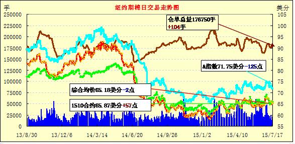 7月17日,美元升值,紐約期棉窄幅震蕩整理;1512月合約結(jié)算價(jià)65.22美分/磅,跌2點(diǎn);1603月合約收于64.98美分/磅,漲2點(diǎn)。當(dāng)日主力合約低開(kāi),全天在64.80至65.20區(qū)間窄幅震蕩,跌幅僅0.03%。短期市場(chǎng)面臨中國(guó)與印度的拋儲(chǔ)壓力,全球棉價(jià)因此被壓制,但下年度全球及美國(guó)、中國(guó)均大幅減產(chǎn),同時(shí)9月后拋儲(chǔ)壓力將減輕,市場(chǎng)焦點(diǎn)將轉(zhuǎn)向新年度產(chǎn)量問(wèn)題,且從CFTC分類持倉(cāng)看,基金依然看好ICE期棉價(jià)格并持有大量?jī)舳鄦?,這將對(duì)期價(jià)形成支撐。