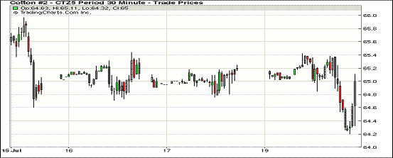 7月20日期棉保持下行趨勢,主力合約先揚后抑,最終收于三周最低價;1512月合約結算價64.67美分/磅,跌55點;1603月合約收于64.61美分/磅,跌37點。當日主力合約開盤后上漲,但很快顯現頹勢,盤中在65.00美分上下波動后再次上漲,下半場交易以下跌為主,最低至64.20美分/磅。周一美元指數突破98,原油、黃金和其他外部市場價格下跌,同時印度季風減弱,但種植面積已超過去年同期。