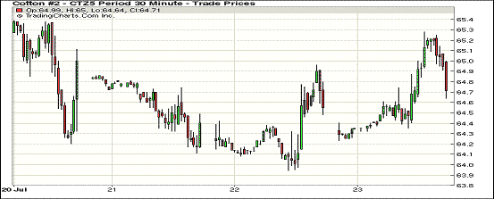 7月23日,美棉簽約及裝運(yùn)繼續(xù)保持強(qiáng)勢(shì),紐約期棉小幅上漲;1512月合約結(jié)算價(jià)64.74美分/磅,漲20點(diǎn);1603月合約收于64.54美分/磅,漲15點(diǎn)。當(dāng)日期棉主力合約以上漲趨勢(shì)為主,下半場(chǎng)交易時(shí)沖至最高價(jià)65.28美分/磅,后小幅回落。漲幅0.31%。至7月16日當(dāng)周,美棉簽約量大幅增加,陸地棉裝運(yùn)率達(dá)99%,下年度新花簽約量良好,利好數(shù)據(jù)支撐ICE期棉上漲。