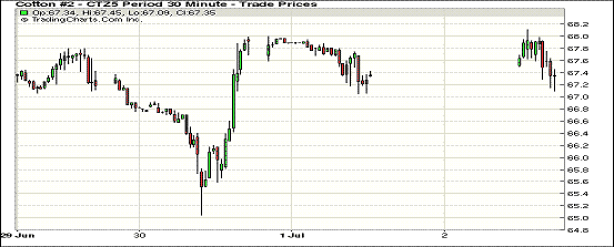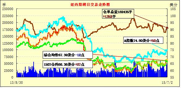 7月2日,美棉出口及裝運利好,期棉沖高回落;1507月合約結(jié)算價66.36美分/磅,漲27點;1512月合約收于67.39美分/磅,跌15點。當日主力合約早間走勢較弱,多次下探67.00美分一下,下半場交易沖高,最高價68.11美分/磅,最終回落收跌,跌幅0.22%。7/12月價差103點。年度末期美棉出口數(shù)據(jù)依然保持利好,出口已超出預計的8%,這將大幅下調(diào)美棉年末庫存。