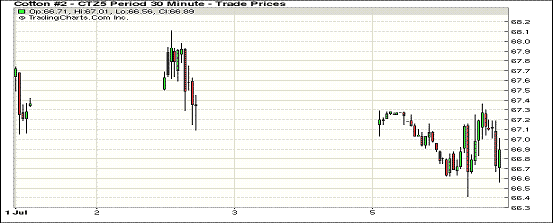 7月6日紐約期棉連續(xù)第三日小幅收低,期棉在上周創(chuàng)下新高后回落;1507月合約結算價66.43美分/磅,漲7點;1512月合約收于66.95美分/磅,跌44點。當日主力合約全天承壓,下半場交易多次反彈失敗,最高價67.36美分/磅,收盤時跌幅0.66%。7/12月合約價差52點。目前美國雷暴天氣多發(fā),給東南棉區(qū)帶來降雨。北三角洲降雨量達3英寸,德州河谷棉區(qū)蟲害控制良好,平原氣溫較高利于棉苗生長,亞利桑那氣溫最高已達110華氏度。
