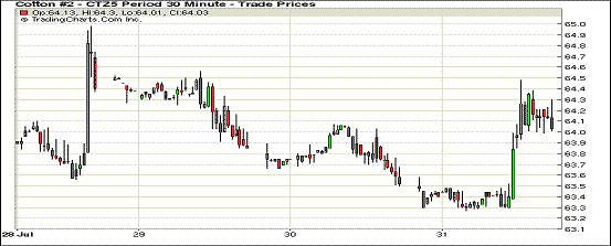 7月31日為本周最后一個(gè)交易日,同樣也是7月和2014/15國(guó)際棉花年度的最后一個(gè)交易日,市場(chǎng)以小幅上漲收盤,主力12月合約結(jié)算價(jià)64.21美分/磅,漲66點(diǎn),1603月合約64.20美分,漲64.20點(diǎn)。當(dāng)日交易先抑后揚(yáng),早盤12月合約在63.2-63.4美分之間低位運(yùn)行,交易中期試圖上攻64美分,交易后期在該水平獲得支撐,終收于近高點(diǎn)。分析師指出,主力合約近日主要在64美分上下波動(dòng),該水平為當(dāng)前的主要支撐位,市場(chǎng)短期內(nèi)仍將維持震蕩格局。利空方面,美國(guó)新花苗情尚可,美國(guó)農(nóng)業(yè)部近期將發(fā)布的供需報(bào)告中將在調(diào)查最大產(chǎn)區(qū)德州情況后可能對(duì)面積進(jìn)行修正;印度主產(chǎn)區(qū)出現(xiàn)降雨;中國(guó)儲(chǔ)備棉輪出成交低迷,買家對(duì)進(jìn)口棉興趣不大。利多方面,2014/15年度美棉出口勢(shì)頭良好,給市場(chǎng)帶來(lái)信心。7月31日12月合約結(jié)算價(jià)64.21美分,相比去年同期的12月合約62.87美分上漲134點(diǎn)。