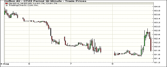 8月10日,空頭回補(bǔ),紐約期棉結(jié)束連跌,小幅收漲;1512月合約結(jié)算價(jià)61.96美分/磅,漲17點(diǎn);1603月合約收于61.95美分/磅,漲7點(diǎn)。當(dāng)日主力合約開(kāi)盤(pán)后下跌,最低價(jià)61.50美分/磅,拉升后一路飆至62.90美分/磅,收盤(pán)前回吐部分漲幅,收于62美分/磅一下。雖然USDA月報(bào)可能上調(diào)美棉種植面積及產(chǎn)量,但新年度美棉產(chǎn)量大幅低于上一年度,且良好的銷(xiāo)售率使期末庫(kù)存處于低位水平,新年度印度可能繼續(xù)啟動(dòng)收儲(chǔ)政策,對(duì)紐約期棉形成支撐。