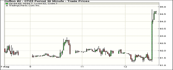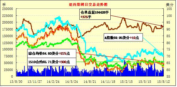 8月12日, 美國農(nóng)業(yè)部下調(diào)美棉產(chǎn)量和全球產(chǎn)量,利好消息刺激紐約期棉大漲;1512月合約結(jié)算價64.69美分/磅,漲287點;1603月合約收于64.09美分/磅,漲226點。當日紐期低開,上半場交易走勢平緩并有下跌趨勢,后受利好消息影響沖高,漲幅4.64%。最新美國農(nóng)業(yè)部預測下調(diào)2015/16年度世界產(chǎn)量,消費量穩(wěn)定并有小幅增加,調(diào)減期末庫存。此消息利好美棉,此外,為應對人民幣貶值,周三美元指數(shù)下跌。