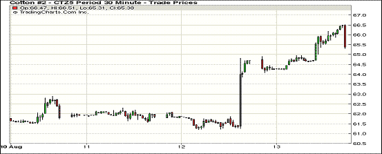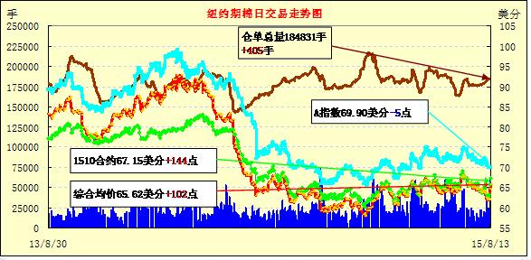 2015/16年度第一周美棉出口數(shù)據(jù)良好,8月12日紐約期棉延續(xù)漲勢并收高;主力12月合約結(jié)算價65.79美分/磅,漲110點,1603月合約64.99美分,漲90點。當日期棉高開高走,最高價突破66美分/磅,收盤前小幅回落。12/3月合約價差80點。7月31日至8月6日一周,美棉簽約量約96900包,裝運99600包,利好數(shù)據(jù)支撐紐約期棉繼續(xù)上漲。
