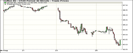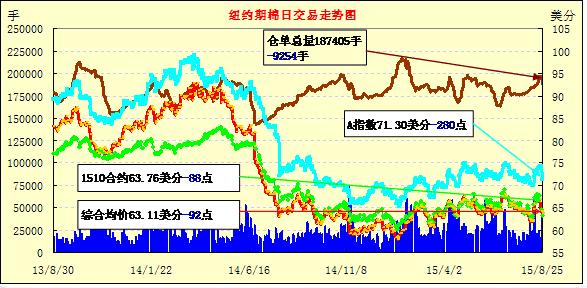 由于市場(chǎng)對(duì)中國(guó)股市暴跌的擔(dān)憂,周二紐期繼續(xù)下探;1512月合約結(jié)算價(jià)63.16美分/磅,跌89點(diǎn);1603月合約收于62.86美分/磅,跌108點(diǎn)。當(dāng)日主力合約大部分交易時(shí)間走勢(shì)相對(duì)平穩(wěn),早間小幅走高,之后受賣盤影響下跌,最低價(jià)62.86%,當(dāng)日跌幅-1.40%。25日晚央行宣布降息降準(zhǔn),但并未緩解市場(chǎng)對(duì)中國(guó)經(jīng)濟(jì)的擔(dān)憂,但當(dāng)日美元指數(shù)大漲,美棉繼續(xù)下跌。