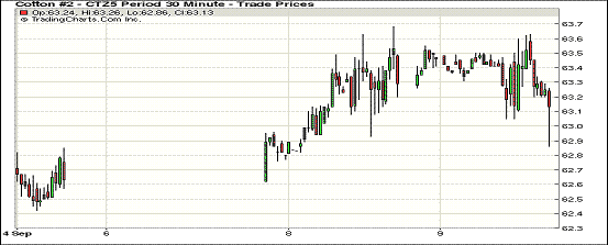 9月9日,紐約期棉窄幅調(diào)整,主力合約小幅收跌; 12月合約結(jié)算價62.92美分/磅,跌36點,1603月合約62.68美分,跌26點。當(dāng)日主力合約全天走勢以上漲為主,但收盤前賣盤壓力回歸市場,合約價小幅收低。 進入九月以來,北半球產(chǎn)區(qū)新花陸續(xù)上市,現(xiàn)貨市場開始主導(dǎo)棉價,中美印減產(chǎn)或繼續(xù)形成支撐。