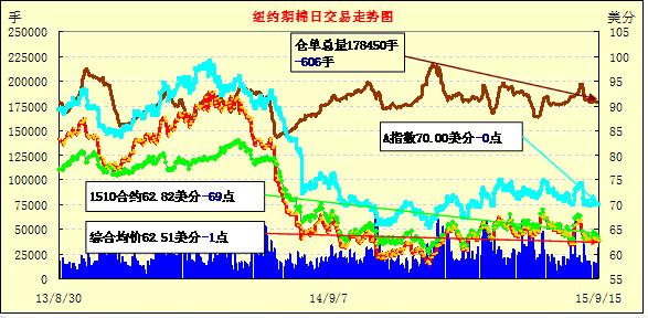 周二期棉漲跌互現(xiàn),主力合約窄幅調(diào)整;主力12月合約結(jié)算價62.52美分/磅,跌3點,1603月合約62.39美分,漲6點。當(dāng)日主力合約窄幅調(diào)整,波動空間僅45點最高62.87美分/磅,最低62.33美分/磅。周四,美聯(lián)儲將發(fā)布就是否升息的貨幣政策聲明,令投資者觀望謹(jǐn)慎,目前中國經(jīng)濟(jì)數(shù)據(jù)疲軟,市場擔(dān)憂宏觀經(jīng)濟(jì),大宗商品價格受到威脅。