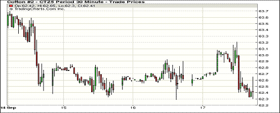 17日美聯(lián)儲宣布推遲加息,美元跳水,但紐約期棉下跌,收盤價創(chuàng)8月以來最低;1512月合約結(jié)算價62.40美分/磅,跌31點,1603月合約62.22美分,跌20點。周四12月合約低開,早間交易上漲,最高價63.21美分/磅,此后開始長達4小時的弱勢走勢,收盤前十分鐘回升。周四美聯(lián)儲表示暫不加息,同時美棉出口保持良好,截至上周美棉簽約出口已達297.8萬包,USDA預測的30%,裝運71萬包,較去年同期大幅減少。