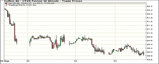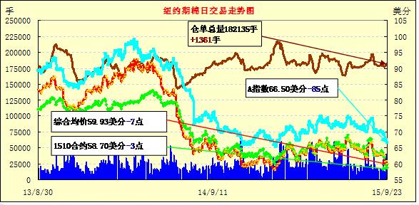 9月23日美元繼續(xù)升值,大宗商品承壓走軟;1512月合約結(jié)算價59.97美分/磅,跌3點;1603月合約收于59.63美分/磅,跌26點。當日紐約期棉主力合約低開,并于61美分/磅以下震蕩整理,早間交易走勢較強,最高60.44美分/磅,隨后回歸弱勢。目前市場焦點集中在中國的經(jīng)濟與需求問題上漲,從美棉銷售數(shù)據(jù)來看,中國買家基本放棄了采購美棉,美棉銷售壓力增加是其價格維持跌勢的主要原因,但新年度全球及主要產(chǎn)棉國減產(chǎn)及印度收儲政策有望對棉價形成支撐,下行空間有限,關(guān)注58美分/磅強支撐位。