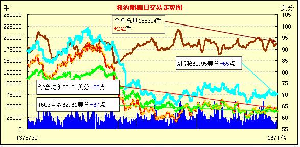 12月4日,紐約期棉繼續(xù)收跌,成交量增加;1603月合約結(jié)算價62.61美分/磅,跌67點(diǎn),1605月合約63.47美分/磅,跌64點(diǎn)。今年第一個交易日,紐約期棉受上證指數(shù)影響走低。主力3月合約受賣盤打壓結(jié)束早間上升走勢。最低價突破近五周以來新低。至本周一美棉分級檢驗(yàn)1048.9萬包,去年同期為1346.6萬包,同比減少22%,預(yù)計(jì)為年度總產(chǎn)量的86%;皮馬棉分級檢驗(yàn)363302包,去年同期為480722包。