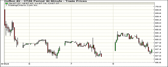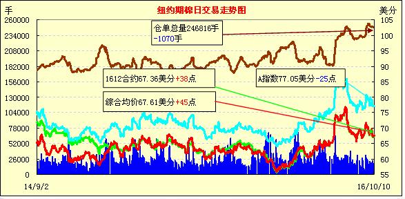 10月10日,紐約期棉市場小幅收漲,近月12月合約結(jié)算價67.36美分,漲38美分。中國期市大漲,美棉上市量逐步增加,內(nèi)外因素下美棉市場成交一般。早盤受鄭棉期貨高開影響,1612月合約早盤沖高,最高68.49美分(+151點)。交易中后期,因賣盤打壓回吐大部分漲幅,以小漲收盤。颶風(fēng)威脅東南棉區(qū)采摘,棉農(nóng)和軋花廠加緊作業(yè),得州等地進(jìn)度正常。
