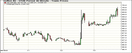 13日,紐約期棉延續(xù)漲勢,但上漲幅度不如前一日大,近期12月合約結(jié)算價(jià)69.31美分/磅,漲34點(diǎn),1703月合約69.74美分,漲35點(diǎn)。12月合約小幅低開,最低跌回前一日上漲之前水平,但盤中受谷物期貨市場上漲及USDA(美國農(nóng)業(yè)部)月報(bào)效應(yīng)支持,最高沖破70美分防線,交易后期回吐部分漲幅,終以小幅上漲收盤。