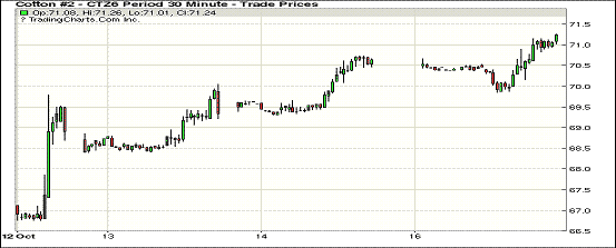 本周第一個交易日美元指數(shù)下跌,紐約期棉繼續(xù)上漲,1612合約收于71.19美分/磅,漲62點;1703合約收于71.49美分/磅,漲60點。當日主力合約開盤后走勢平穩(wěn)并略有下跌,但很快在買盤支撐下走高,當日主力合約最高價71.26美分/磅,最終收于交投區(qū)間高位。本周美棉采摘進度30%,較上周增8個百分點;美國15個棉區(qū)平均吐絮89%,較上周增9個百分點;不正常的苗情17%,較上周增加1%。