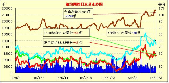 周一外部市場上漲帶動紐約期棉小幅走高;1612合約收于68.52美分/磅,漲44點(diǎn);1703合約收于69.01美分/磅,漲47點(diǎn)。當(dāng)日主力合約開盤后微幅下跌,近月合約整體走弱,盤中買盤介入,支撐價(jià)格上漲。至本周,美棉采摘進(jìn)度16%,較上周增6個百分點(diǎn),略高于去年同期和近五年平均。颶風(fēng)“馬修”即將登陸加勒比海沿岸國家,可能對美國南部棉區(qū)造成影響。