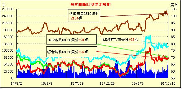 上周美棉簽約出口較前周和近四周平均簽約增加,紐約期棉上漲;1612合約收于69.20美分/磅,漲91點(diǎn);1703合約收于69.83美分/磅,漲97點(diǎn)。當(dāng)日新花3月合約得到支撐上漲,最高價(jià)突破70美分一線,后半天交易時(shí)合約回落,但依然處于震蕩區(qū)間上部。至11月3日,美國陸地棉簽約達(dá)到USDA預(yù)測(cè)出口總量的56%,領(lǐng)先去年同期。