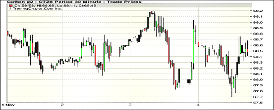 4日,紐約期棉市場小幅反彈,近期12月合約結(jié)算價68.53美分/磅,漲46點,1703月合約69.1美分,漲42點。當日12月合約上半場交易在68.2-68.7美分間窄幅波動,交易中期下滑68美分失守跌落至10月21日來低位,后獲點價盤支持反彈至68.5美分一線,終以小漲收盤。分析指出,68美分處獲明顯點價盤支持,據(jù)CFTC統(tǒng)計,4日當周12月合約上紡織廠點價968手,棉農(nóng)點價601手。