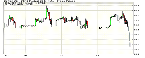 本周第一個(gè)交易日,紐約期棉大跌,合約價(jià)下跌從68-227點(diǎn)不等;1605月合約58.69美分/磅,跌85點(diǎn);1607月合約59.00美分/磅,跌68點(diǎn)。當(dāng)日主力合約震蕩區(qū)間繼續(xù)擴(kuò)大,最高價(jià)在60.00美分/磅以上,當(dāng)日主力合約大部分時(shí)間處于漲幅區(qū)間,后在賣(mài)盤(pán)打壓下下跌并收于低。創(chuàng)2月9日以來(lái)最大跌幅。據(jù)美國(guó)農(nóng)業(yè)部,美棉分級(jí)檢驗(yàn)5.5萬(wàn)包新花,至上周末,已檢驗(yàn)新花達(dá)到預(yù)計(jì)產(chǎn)量的99%,其中僅55.4%達(dá)到紐約期棉交易要求。