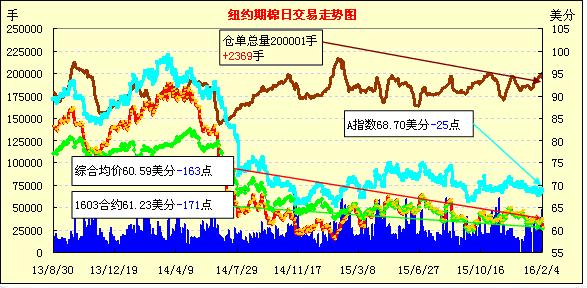 周四雖然美棉出口大增,美元指數(shù)上漲,但預(yù)計(jì)中國(guó)拋儲(chǔ)將增加供應(yīng)打壓全球棉價(jià),周四紐約期棉繼續(xù)下跌;1603月合約結(jié)算價(jià)60.23美分/磅,跌171點(diǎn),1605月合約60.70美分/磅,跌171點(diǎn)。當(dāng)日紐約期棉全面暴跌,創(chuàng)近四個(gè)月以來(lái)最大跌幅,近月合約開(kāi)盤(pán)后即開(kāi)始下跌,最低價(jià)已跌破60.00美分/磅。拋儲(chǔ)傳聞繼續(xù)引發(fā)期棉下跌,但世界兩大出口國(guó)美國(guó)與印度棉花銷(xiāo)售進(jìn)度良好,國(guó)際市場(chǎng)供需略微偏緊將對(duì)棉價(jià)構(gòu)成支撐,對(duì)下跌謹(jǐn)慎對(duì)待,關(guān)注3月合約59.5美分/磅一線的支撐位。
