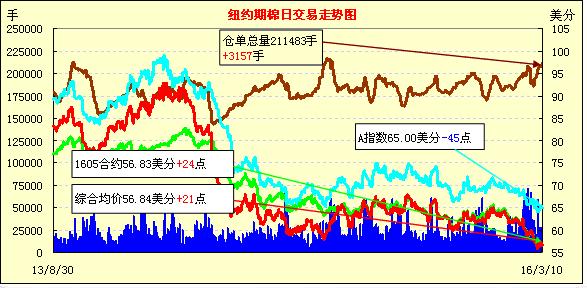 周四公布的美棉出口量較前一周增加,利好刺激紐約期棉微幅反彈;1605月合約收于56.83美分/磅,漲24點;1607月合約收于56.77美分/磅,漲19點。當日主力合約開盤和收盤時上漲,其余時間基本處于跌幅區(qū)間。受美元指數(shù)下跌和美棉出口增加雙重利好刺激,紐約期棉于周四小幅上漲,但拋儲細則尚未公布,漲勢恐難以持續(xù)。