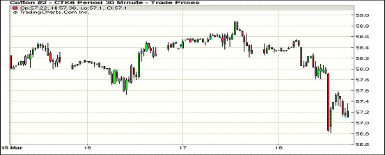 3月18日,中國明確4月中旬拋儲,同時美元指數(shù)上漲,CRB指數(shù)下跌;1605月合約收于57.16美分/磅,跌120點;1607月合約收于57.06美分/磅,跌123點。當(dāng)日紐約期棉平開,早間小幅上漲,之后遭賣盤壓力大跌。當(dāng)日主力合約跌幅超2%,并將本周漲幅全部回吐。本周棉業(yè)發(fā)展會議中公布了部分拋儲方針,中國低價拋儲可能導(dǎo)致對進口棉、紗的需求放緩,從而繼續(xù)影響國際市場棉花消費,對國際棉價與紗價構(gòu)成壓力。