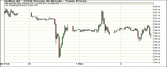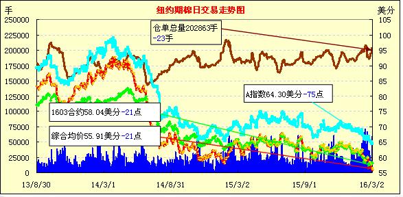 3月2日紐約期棉繼續(xù)下跌,主力合約跌破56美分/磅;1605月合約結(jié)算價(jià)55.93美分/磅,跌18點(diǎn);1607月合約收于55.77美分/磅,跌37點(diǎn)。當(dāng)日主力合約早間有所反彈,但下半場交易時(shí)多單獲利平倉,導(dǎo)致部分漲幅回吐,ICE期棉繼續(xù)收跌。目前棉價(jià)連續(xù)陰跌,等級庫存增加至7萬包以上,本月ICAC預(yù)測下調(diào)消費(fèi)預(yù)測,對消費(fèi)棉的擔(dān)憂和對中國儲(chǔ)備棉的投放成為市場主要悲觀因素。