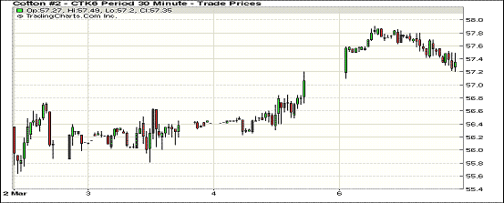 3月7日,商品市場普漲,紐約期棉延續(xù)反彈趨勢;1605月合約57.38美分/磅,漲27點;1607月合約57.35美分/磅,漲64點。當日主力合約漲幅區(qū)間在27點到65點,合約價早間即達到57.90美分/磅,收盤前略有回落。中國政府表示將確保經(jīng)濟穩(wěn)健成長,這刺激大宗商品市場多頭人氣,周一CRB指數(shù)收高1.87%,紐約期棉連續(xù)三日收漲。