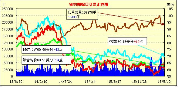 周二紐約期棉繼續(xù)下跌,登記庫(kù)存增加;1607月合約60.90美分/磅,跌43點(diǎn);1612月合約60.91美分/磅,跌13點(diǎn)。當(dāng)日大部分近月合約走弱,USDA供需預(yù)測(cè)發(fā)布后跌勢(shì)更為明顯,收盤前合約價(jià)保持在震蕩區(qū)間底部。5月USDA供需報(bào)告顯示,2016/17年度美棉種植面積約在956萬(wàn)英畝,平均產(chǎn)量在807磅/英畝,實(shí)際收獲面積880萬(wàn)英畝總產(chǎn)量較2015/16年度上調(diào)15%。