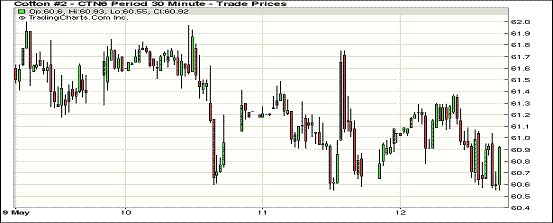 5月12日紐約期棉行情相對(duì)穩(wěn)定,7月合約結(jié)算價(jià)60.37美分/磅,漲13點(diǎn),12月合約60.57美分,跌1點(diǎn)。當(dāng)日7月合約早盤上漲,交易中期行情疲軟,到交易后期維持在日高區(qū)間波動(dòng),最終以止跌收盤。據(jù)美國(guó)農(nóng)業(yè)部(USDA),上周美陸地棉凈簽約出口量2.3萬(wàn)噸,較前一周增加69%,較近四周平均增加38%。