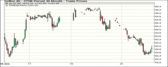 6月21日,受商品市場(chǎng)整體表現(xiàn)弱勢(shì)和中國(guó)鄭棉大跌帶動(dòng),在經(jīng)歷連續(xù)三日上漲后,主力1612月合約以大跌收盤,結(jié)算價(jià)64.39美分/磅,跌160點(diǎn),近月1607合約結(jié)算價(jià)62.85美分,跌154點(diǎn)。當(dāng)日1612月合約高開(kāi)后未能站穩(wěn)66美分高位,交易中期尋求65美分一線的支撐,交易后期重心繼續(xù)下移,尾段在64-64.5美分間波動(dòng),最終收于該區(qū)間。美元指數(shù)走高、谷物(大豆、玉米和小麥期貨)均下跌,以及鄭棉大跌,紐約期棉承壓。