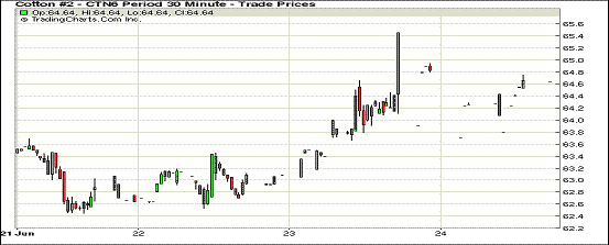 周五美元因英國(guó)脫歐公投大漲,紐約期棉走低,跌幅超1%;1607月合約64.50美分/磅,跌38點(diǎn);1612月合約64.42美分/磅,跌100點(diǎn)。當(dāng)日1612合約走勢(shì)低迷,最低跌破64美分,合約價(jià)當(dāng)周下跌共150點(diǎn)。 周五美元指數(shù)漲2.01%,包括棉花在內(nèi)的商品價(jià)格走低,CRB指數(shù)跌幅2.47%。此外,美國(guó)棉區(qū)天氣利好,新花漲勢(shì)喜人。