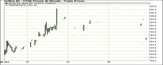 周一,紐約期棉表現(xiàn)弱態(tài),近期7月合約結(jié)算價63.48美分/磅,跌102點(diǎn),主力12月合約64.38美分,跌4點(diǎn)。市場關(guān)注焦點(diǎn)放在6月最后交易日USDA(美國農(nóng)業(yè)部)的棉花實(shí)播面積報(bào)告上,成交量下滑。12月合約平穩(wěn)開盤后走高,最高站上65.40美分的日高點(diǎn),交易后期市場整體氛圍偏弱,該合約從高位下滑,最終微幅低收。據(jù)路透社最新預(yù)測,下年度美棉種植面積預(yù)期954.1萬英畝,低于USDA3月份預(yù)測的956.2萬英畝。USDA將于本周四發(fā)布實(shí)播報(bào)告。