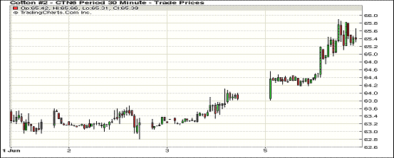 周一紐約期棉延續(xù)上周五漲勢,所有合約價上漲超過百點;1607月合約65.55美分/磅,漲163點;1612月合約65.54美分/磅,漲163點。周一紐約原油期貨上漲1.07美元,油價接近50美元/桶,當(dāng)日紐約期棉7月和12月合約均開盤走高,在短暫的震蕩后買盤給合約上漲帶來支撐,7/12月合約突破阻力上漲,7月合約最高價65.90美分/磅。至5月底,本年度美國陸地棉簽約187.3萬噸,裝運148.4萬噸,簽約量達到預(yù)計出口量的100%,裝運率79%。