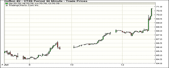 受USDA預測報告影響,12日紐約期棉再次上漲,主力合約突破70美分。1610合約71.14美分/磅,漲300點;1612合約70.78美分/磅,漲300點。周二USDA報告發(fā)布前,主力合約窄幅震蕩,預測發(fā)布后投機買盤增加,合約價迅速上漲,收盤時1612合約創(chuàng)近兩年來最高價。美國農業(yè)部7月預測上調了2016/17年度世界消費,并下調產量和期末庫存。其中印度和巴基斯坦產量調減,美棉產量調增;中國消費調增。報告總體利好。