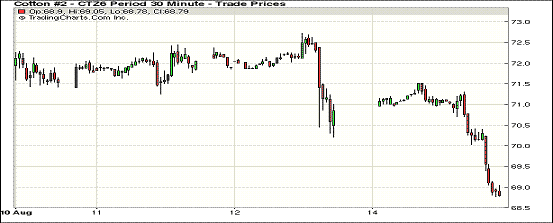 美國農(nóng)業(yè)部(USDA)報告利空影響延續(xù),周一紐約期棉市場連續(xù)以百點以上幅度下跌,全線跌破70美分/磅,近期10月合約結(jié)算價68.09美分/磅,跌179點,主力12月合約結(jié)算價68.86美分/磅,跌179點。當日市場小幅高開,主力合約早盤徘徊于70美分以上,后因賣盤打壓連續(xù)跌破70美分和69美分,回到7月中旬啟動大漲之際的水平。USDA報告中意外調(diào)高美棉產(chǎn)量,市場進一步消化利空。