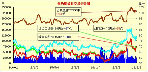 周五,雖然美棉出口數(shù)據(jù)良好,但紐約期棉市場(chǎng)繼續(xù)弱勢(shì)下跌,主力12月合約結(jié)算價(jià)69.08美分,跌21點(diǎn),1703月合約69.30美分,跌30點(diǎn)。當(dāng)日12月合約先高后低,整日交易在68.25-69.35美分區(qū)間波動(dòng),交投活躍度有限。雖然美國(guó)農(nóng)業(yè)部報(bào)告顯示上周美棉出口保持良好勢(shì)頭,但業(yè)內(nèi)有分析機(jī)構(gòu)認(rèn)為后期美棉產(chǎn)量和出口量仍有上調(diào)可能,對(duì)市場(chǎng)形成壓力,另外,美元指數(shù)上漲對(duì)市場(chǎng)稍有影響,最終期棉市場(chǎng)在利好的出口周報(bào)發(fā)布后仍以小幅下跌收盤。