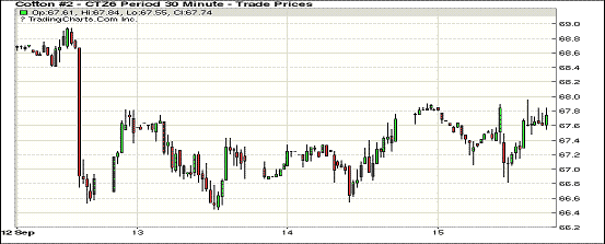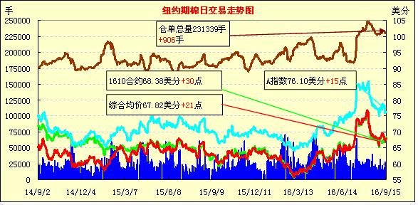 周四紐約期棉連續(xù)震蕩上漲,所有合約小幅收高;1612合約收于67.72美分/磅,漲19點;1703合約收于67.91美分/磅,漲17點。當(dāng)日公布的美棉出口銷售疲軟,早間主力合約最低跌至66.82美分/磅,之后天氣預(yù)測降雨,期棉得到買盤支持上漲并小幅收高。9月2日至8日,本年度美國陸地棉簽約13.64萬包,下年度陸地棉簽約2.62萬包,陸地棉裝運12.49萬包。至9月8日,陸地棉簽約已達(dá)到預(yù)測出口量的44%