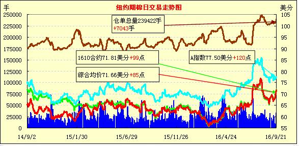 周三紐約期棉繼續(xù)上漲,主力合約漲幅逾1%;1612合約收于71.62美分/磅,漲82點(diǎn);1703合約收于71.73美分/磅,漲90點(diǎn)。當(dāng)日主力合約前期走勢缺乏方向,之后買盤介入并保持活躍,主力合約最高漲至72美分/磅以上。周三鄭棉和紐約期棉繼續(xù)保持聯(lián)動,影響ICE期棉走高,此外對德克薩斯南部棉區(qū)降雨的擔(dān)憂也對棉價(jià)形成支撐。周三美元指數(shù)走低。