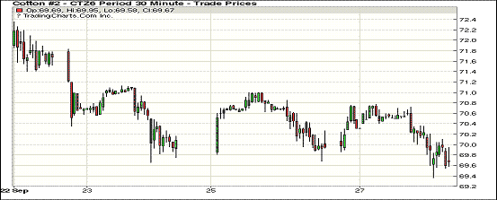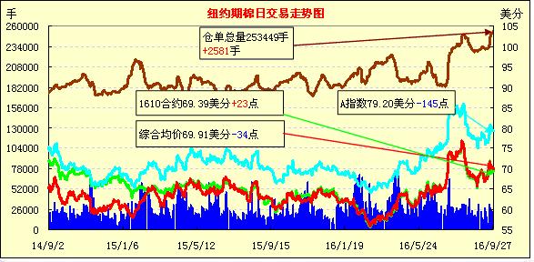 周二紐約期棉除1610合約外,其他合約全部小幅收跌;1612合約收于69.74美分/磅,跌34點(diǎn);1703合約收于70.24美分/磅,跌30點(diǎn)。當(dāng)日主力12月合約在短暫的上漲后下跌,最高價(jià)70.77美分/磅,合約震蕩區(qū)間超出前一交易日。本周棉區(qū)天氣改善,德州西部和三角洲棉區(qū)天氣良好對棉價(jià)形成不利因素。