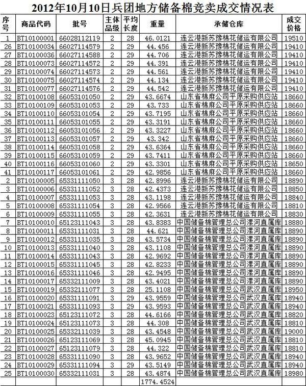 10月10日兵團棉花競賣成交結果