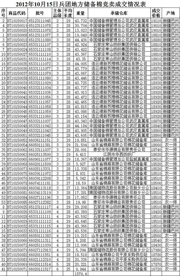 10月15日兵團(tuán)棉花競賣成交結(jié)果
