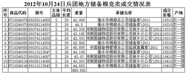 10月24日兵團(tuán)棉花競賣成交結(jié)果