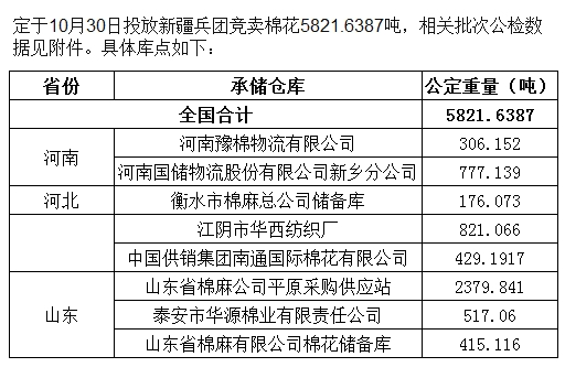 錦橋紡織網(wǎng)—資訊頻道> 棉花信息> 拋儲(chǔ)>正文 10月30日兵團(tuán)棉花競(jìng)賣預(yù)告:計(jì)劃投放5822噸